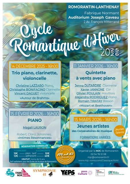 De décembre 2025 à mars 2026, la Maison des Jeunes et de la Culture de Romorantin propose une série de 4 concerts de musique classique à l'Auditorium Joseph Gaveau (Fabrique Normant).