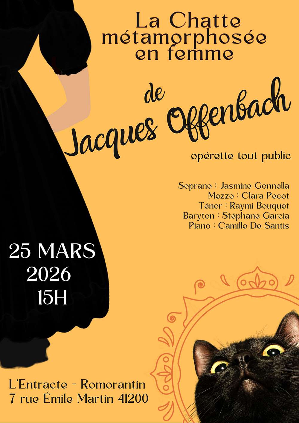 La compagnie Mannéïvore revisite avec humour et légèreté cette savoureuse opérette d’Offenbach, où fantaisie et malice s’entrelacent au rythme d’une partition pétillante. Dans une mise en scène drôle, enjouée et saupoudrée d’un brin de magie, suivez les aventures d’un jeune homme épris… de sa chatte, qui, grâce à un enchanteur farfelu, prend soudain forme humaine ! Une farce tendre et délirante où les quiproquos, les sortilèges et les airs entraînants ravissent petits et grands.
