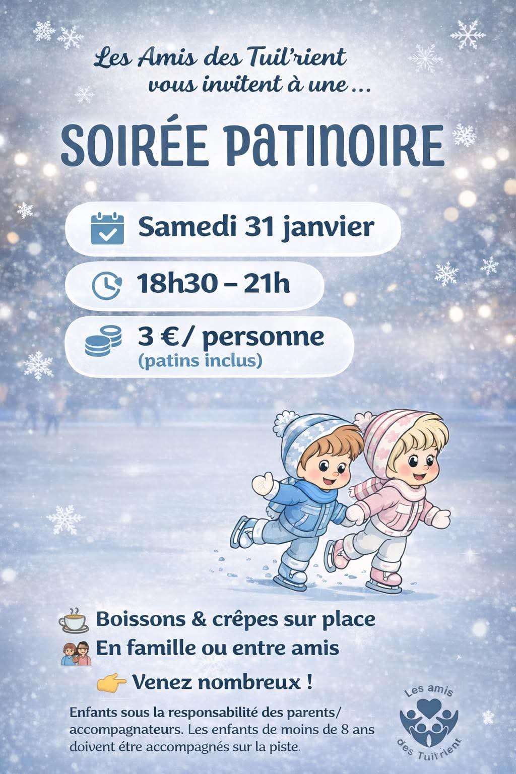 ⛸L'association Les Amis des Tuil'rient invitent à une soirée à la patinoire de 18h30 à 21. 3€ patins inclus.
