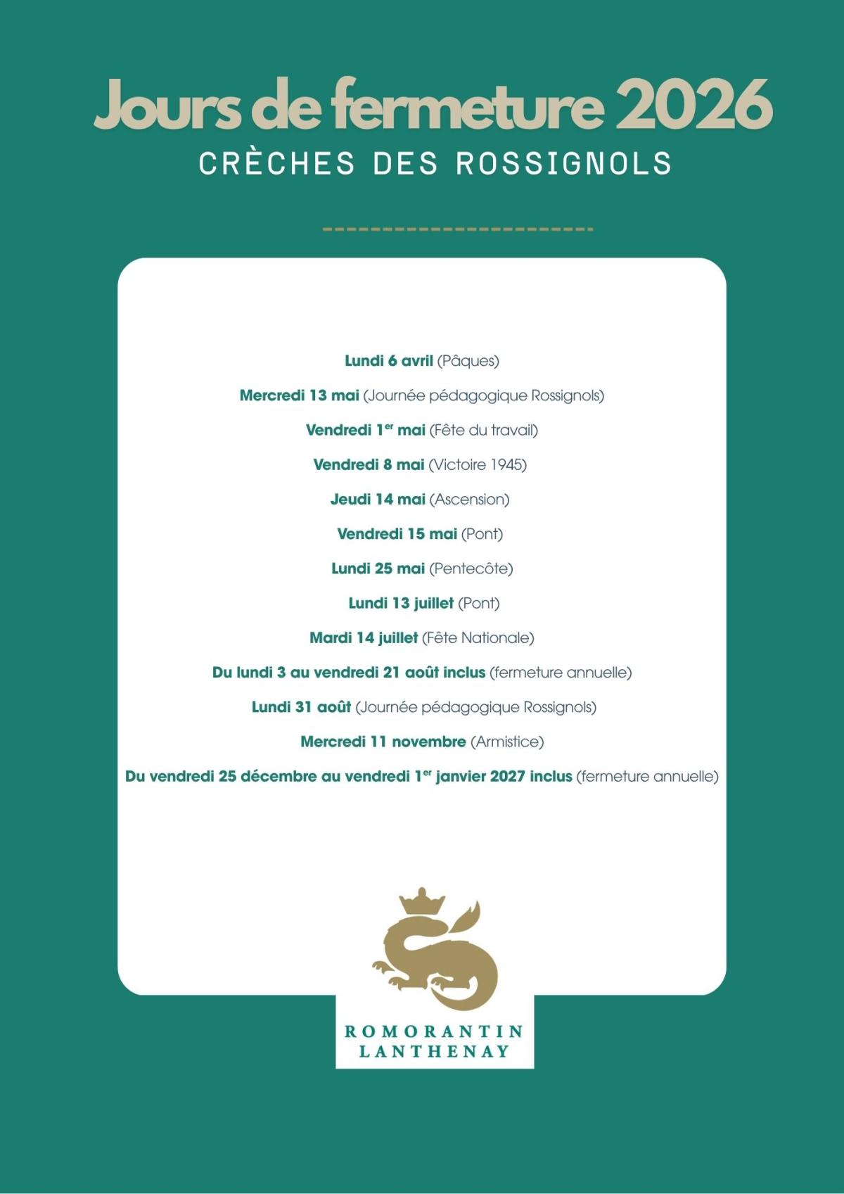 Jours de fermeture 2026 - Crèche des Rossignols